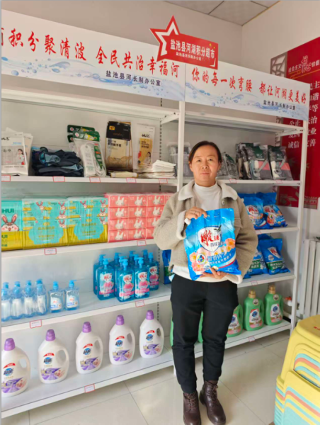 首单积分兑换者是来自青山乡郝记台村村民的贾惠娟,通过反馈方山沟岸边存在垃圾问题,从而成功获得5分,在本村河湖积分超市兑换到了日常生活用品1份。