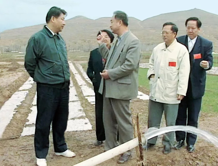 1997年4月,习近平在宁夏隆德县考察,了解抽水灌溉情况。