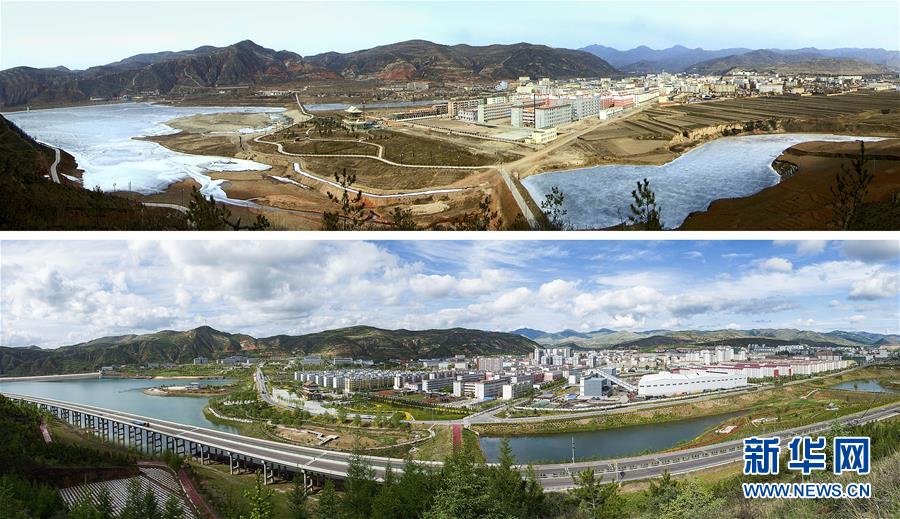 拼版照片:上图为2009年1月30日拍摄的宁夏固原市隆德县境内的渝河景象;下图为经过流域综合治理后的渝河(2018年5月19日摄)。 新华社发(李玉 摄)
