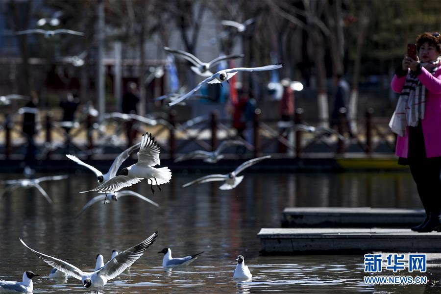 红嘴鸥在宁夏银川市燕鸽湖公园觅食(3月21日摄)。 新华社记者 冯开华 摄