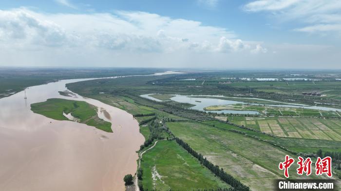 7月13日,航拍黄河宁夏银川段。夏日,黄河宁夏段两岸绿意盎然。滔滔黄河水蜿蜒流淌,构成一幅美丽的生态画卷。(无人机照片)中新社记者 于晶