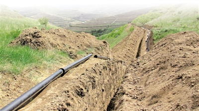 管材和砂石料只能运到离施工地相对较近的地方,然后用毛驴驮,实在没办法,就只有人抬肩扛。一根根6米长、163斤重管道,是由2个壮劳力上上下下、翻山下沟运送的。工人的肩膀压烂了,借群众驮沙子的母驴也被压流产了。733公里的管网,终于铺好了。
