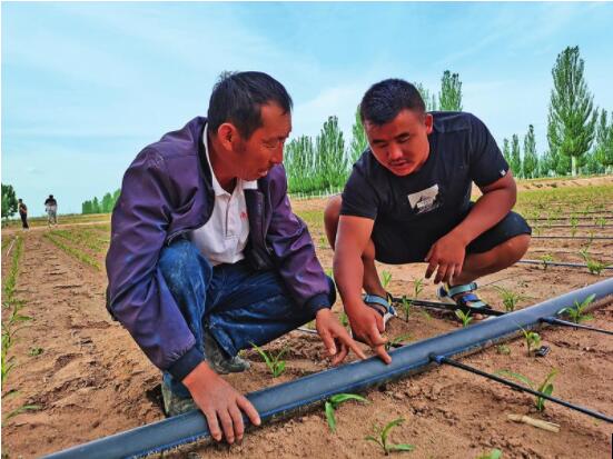 5月18日,在盐池县冯记沟乡马儿庄村的农田里,村民王金林(左)和关伟在查看滴灌管。丁宝萍摄