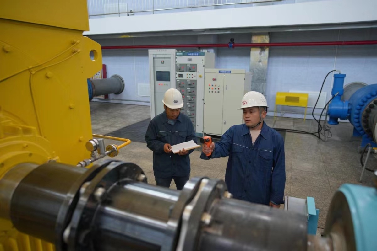 工作人员查看清水河流域城乡供水工程同心二泵站机组温度。