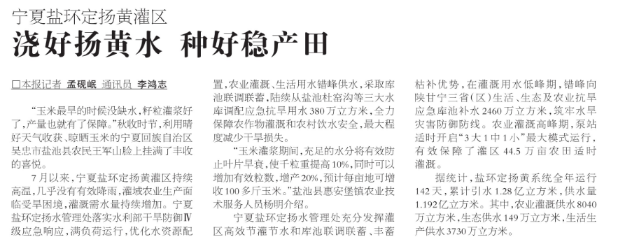宁夏盐环定扬水管理处充分发挥灌区高效节灌节水和库池联调联蓄、丰蓄枯补优势,在灌溉用水低峰期,错峰向陕甘宁三省(区)生活、生态及农业抗旱应急库池补水2460万立方米,筑牢水旱灾害防御防线。农业灌溉高峰期,泵站适时开启“3大1中1小”最大模式运行,有效保障了灌区44.5万亩农田适时灌溉。