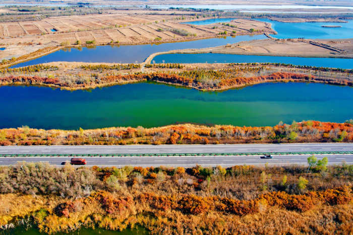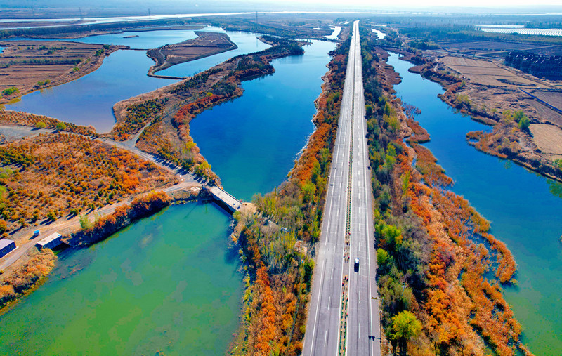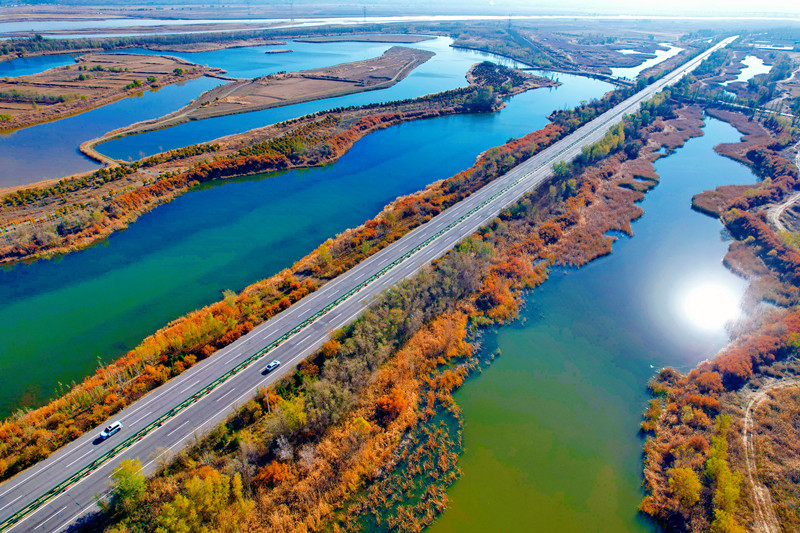 黄河岸边水系纵横,笔直的滨河大道贯穿其中。