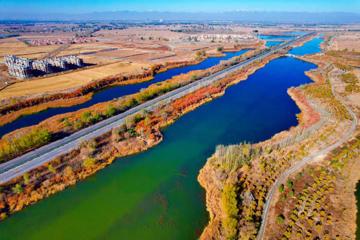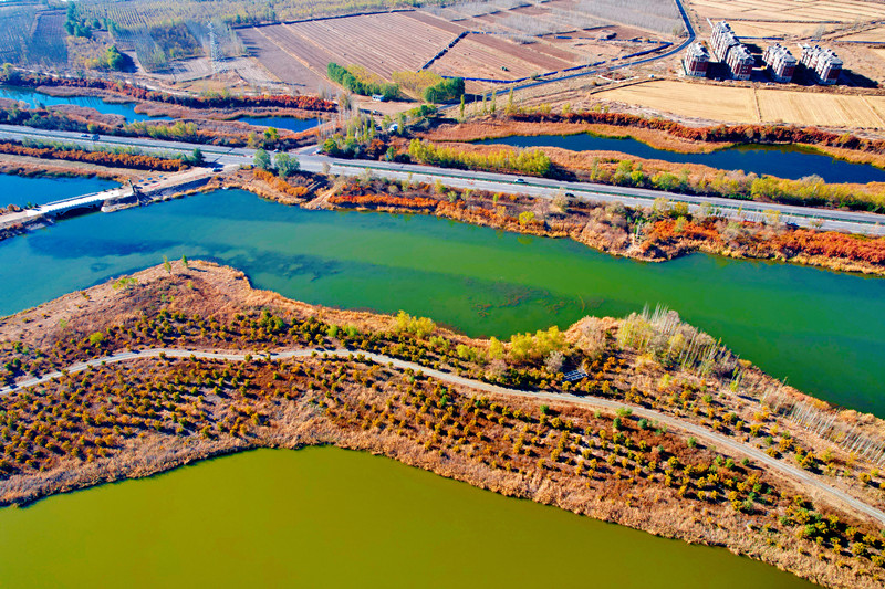 俯瞰黄河贺兰段湿地,由蓝渐绿的水面与红黄相间的树叶构成色彩丰富的“调色盘”。