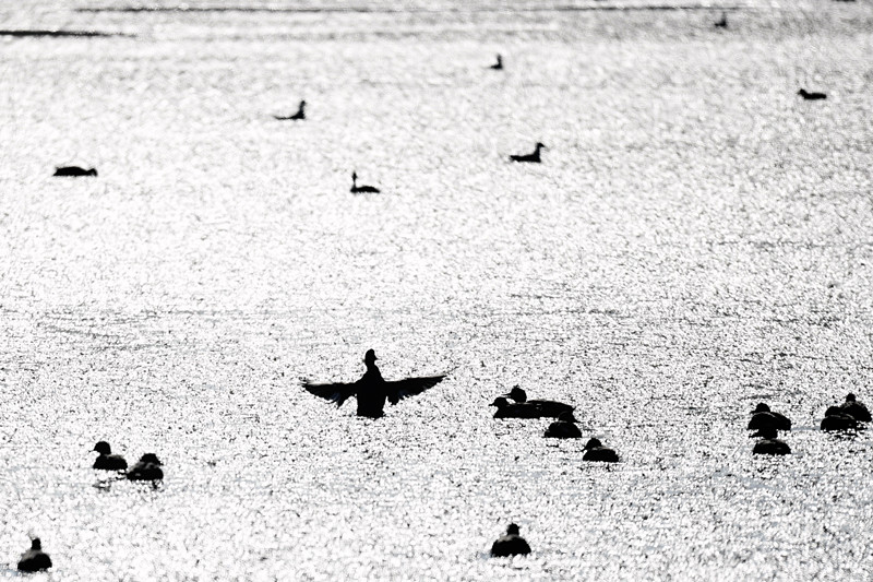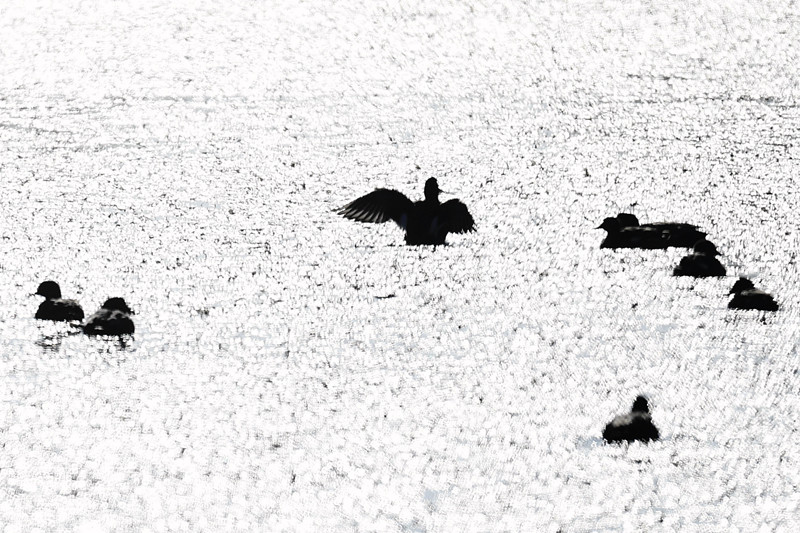 逆光眺望,鸟儿活泼的身影在泛起银光的水面“翩翩起舞”。