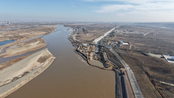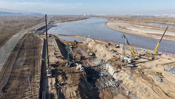 12月7日,中卫市沙坡头区永康镇申滩村黄河右岸,“塞北都江堰”——七星渠进水口翻建工程正在进行围堰、降水等准备工作。这座在黄河边服务了50年的工程将在明年4月“破茧成蝶”:闸门由3孔增至4孔,闸底高程下降80厘米,增加无坝引水动力,为245万亩农田灌溉及120万人安全饮水持续供水。