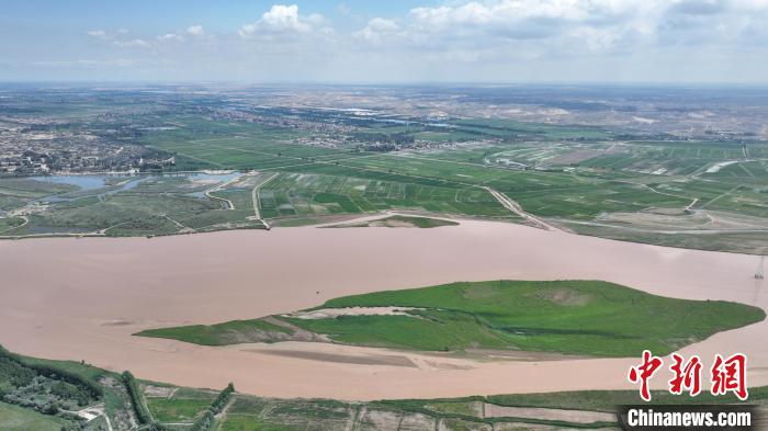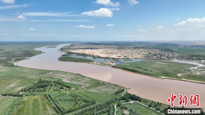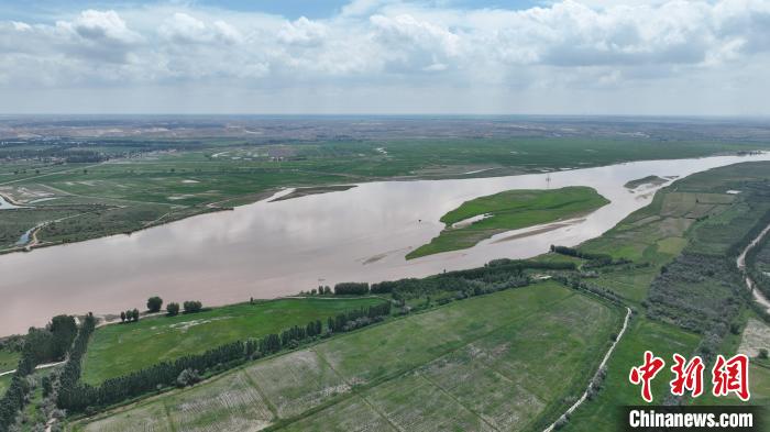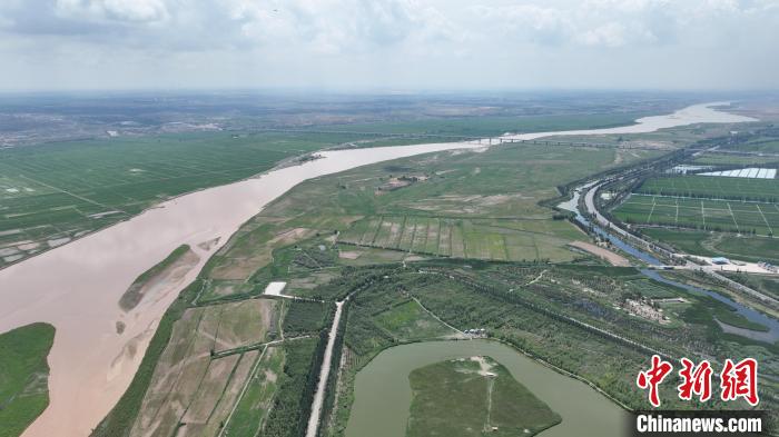 7月13日,航拍黄河宁夏银川段。夏日,黄河宁夏段两岸绿意盎然。滔滔黄河水蜿蜒流淌,构成一幅美丽的生态画卷。(无人机照片)中新社记者 于晶