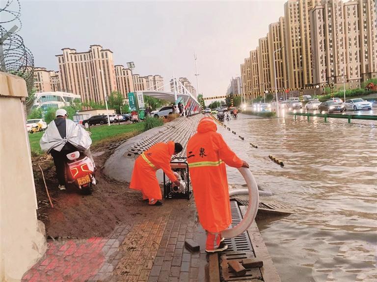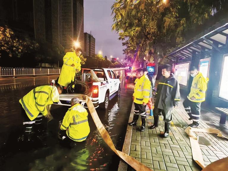 7月18日晚,在银川市上海路,市政部门工作人员抽排路面积水。