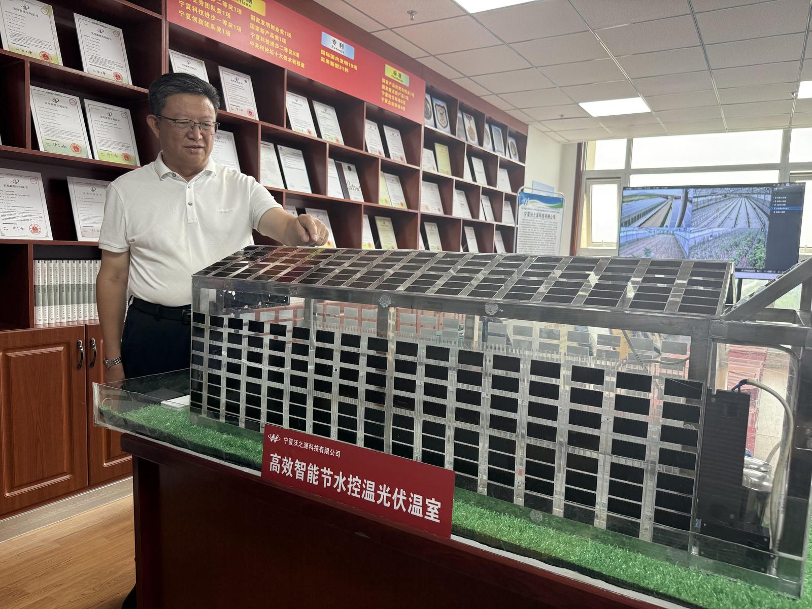 8月24日,步入宁夏沃之源科技有限公司的产品展示区,一束阳光穿过窗户,柔和地照亮了墙上整齐悬挂的数十张专利证书,银色边框闪烁着细腻的光芒。展台上,几段看似普通的黑色软管、几个充满科技感的光伏农业温室模型安静陈列——它们外表朴素,却已在阿拉伯的广袤沙漠中催生一片片生机。