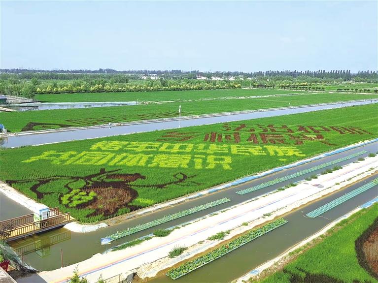 贺兰县稻渔空间生态观光园里的铸牢中华民族共同体意识稻田画。