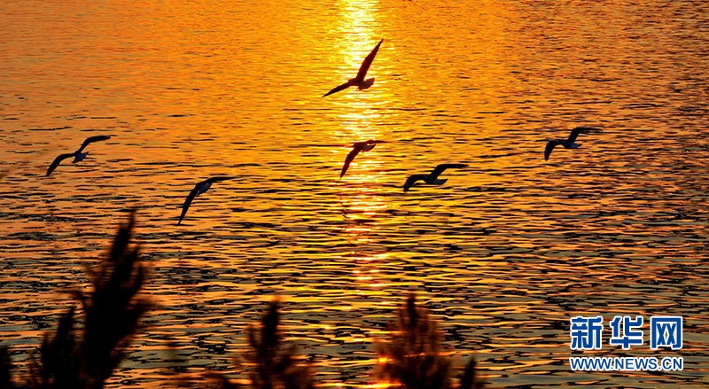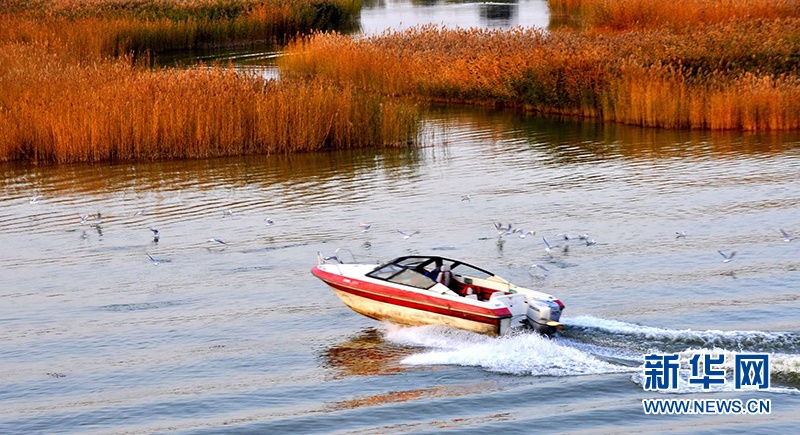 摇曳的芦苇、辽阔的秋湖、慢行的骆驼、戏水的鱼儿、飞翔的群鸟构成了一幅美丽的秋日画卷。