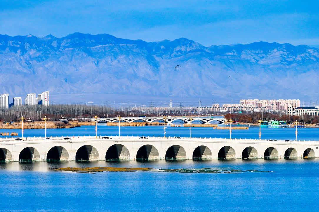 通透纯粹的“银川蓝”与碧波荡漾的阅海平分秋色,远处的贺兰山连绵起伏,轮廓清晰可辨,构成了冬日里最动人的风景。