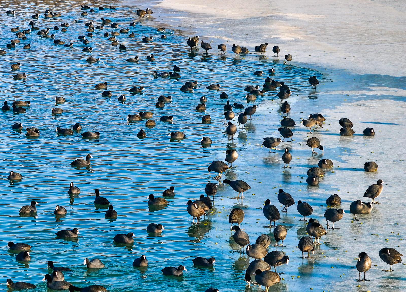 骨顶鸡或在水中嬉戏,或在冰面上闲庭信步,悠然自得。