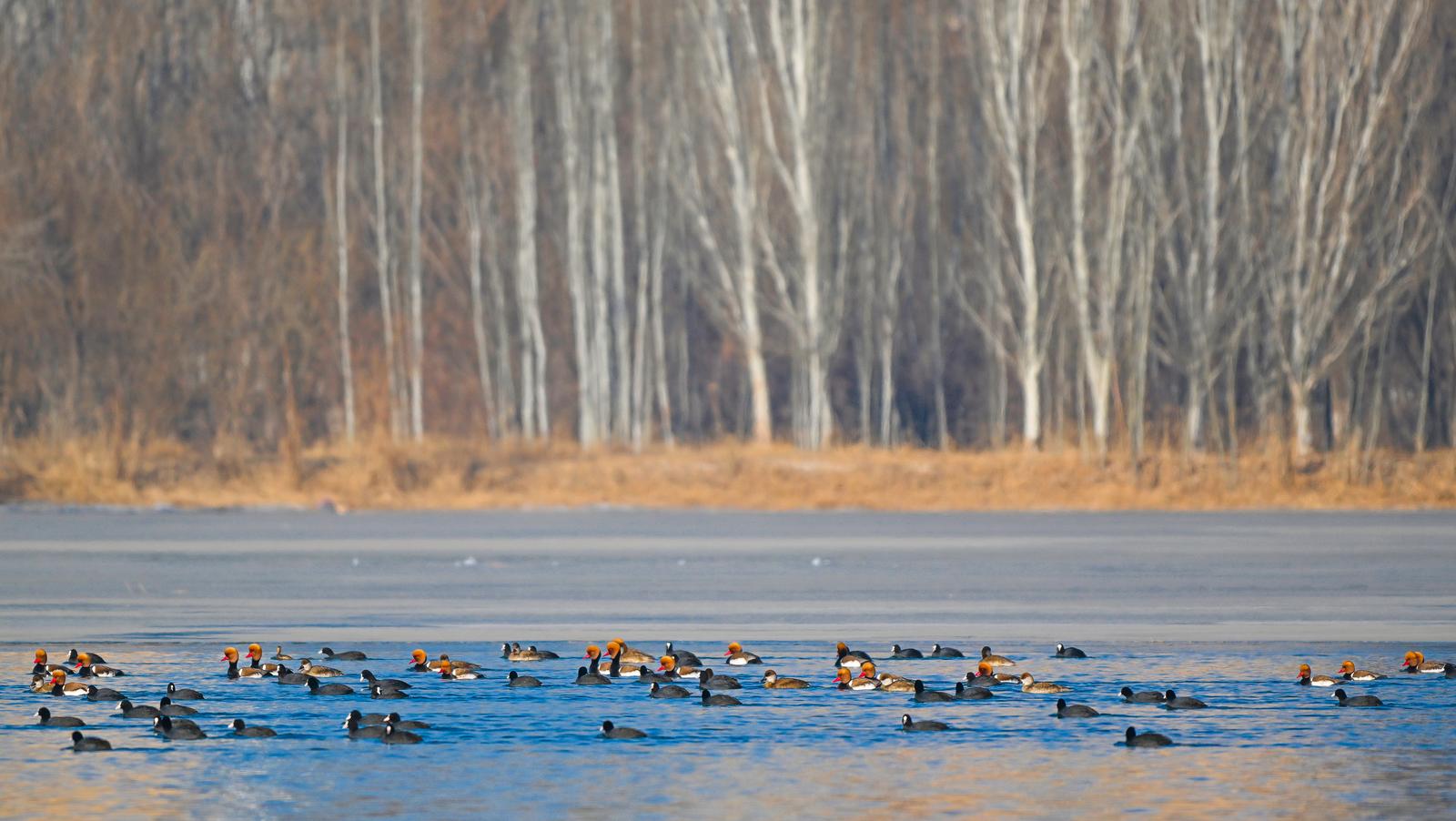 一幅“冰湖映候鸟”的生态美卷徐徐展开。