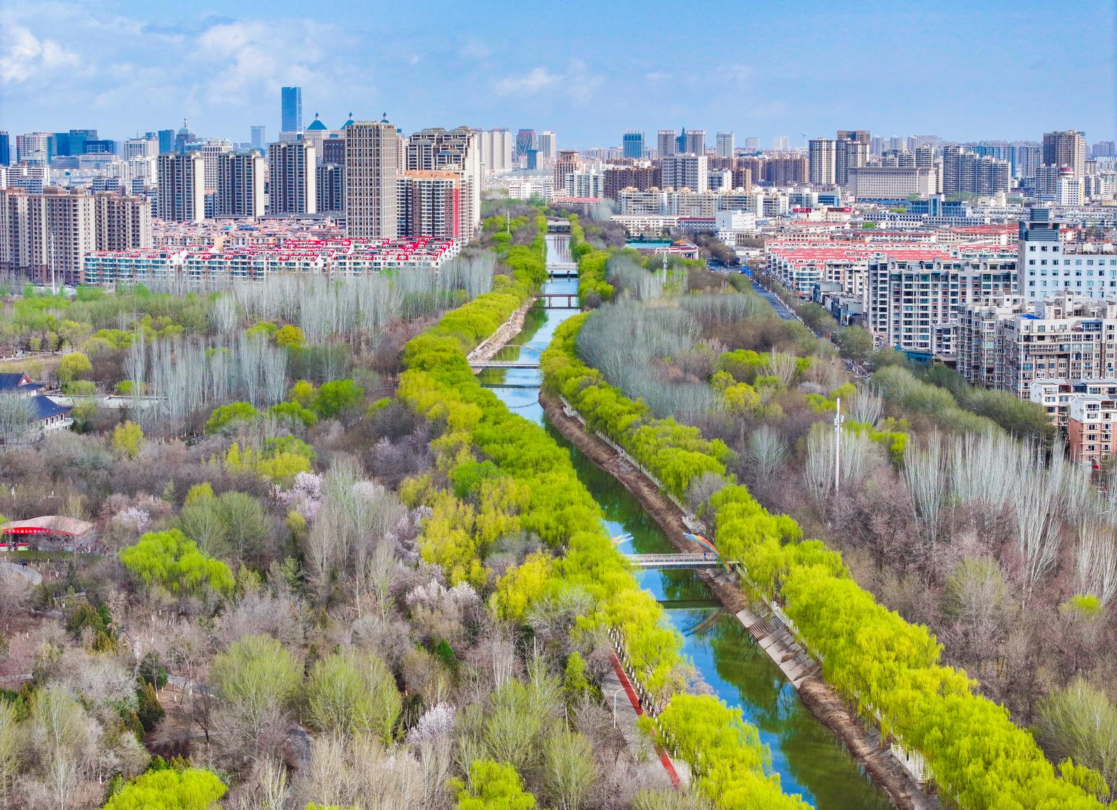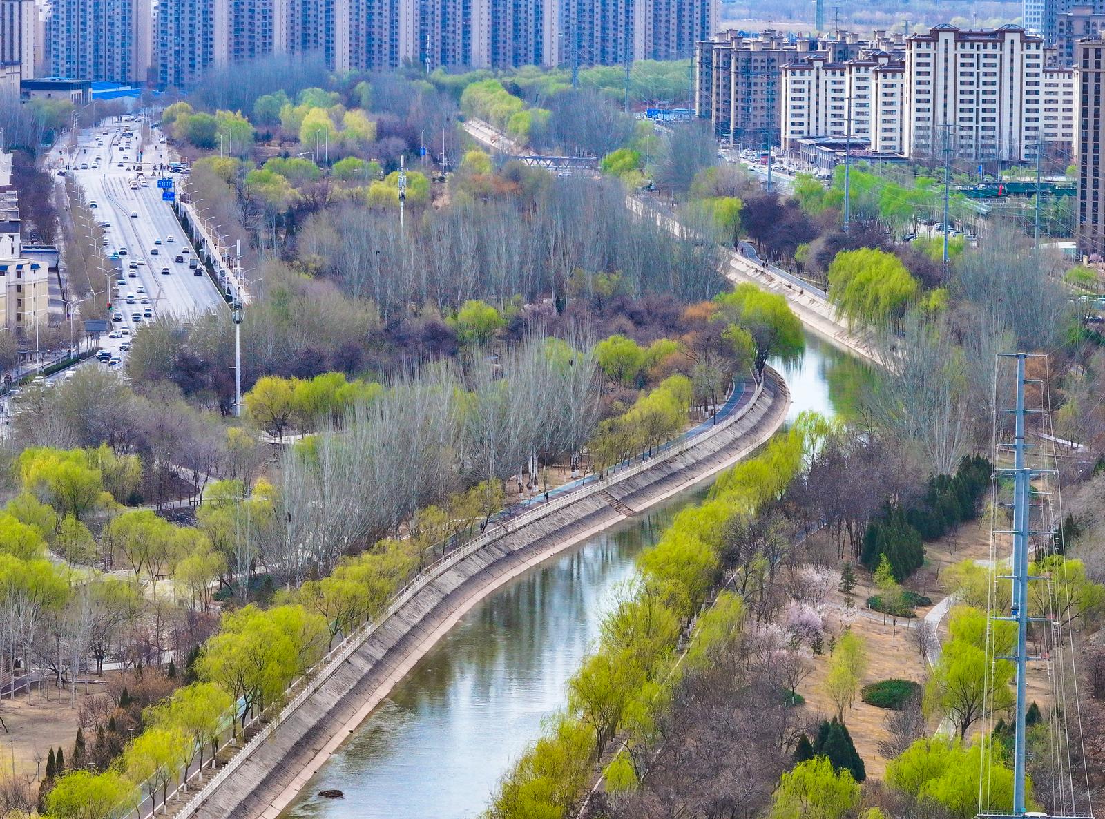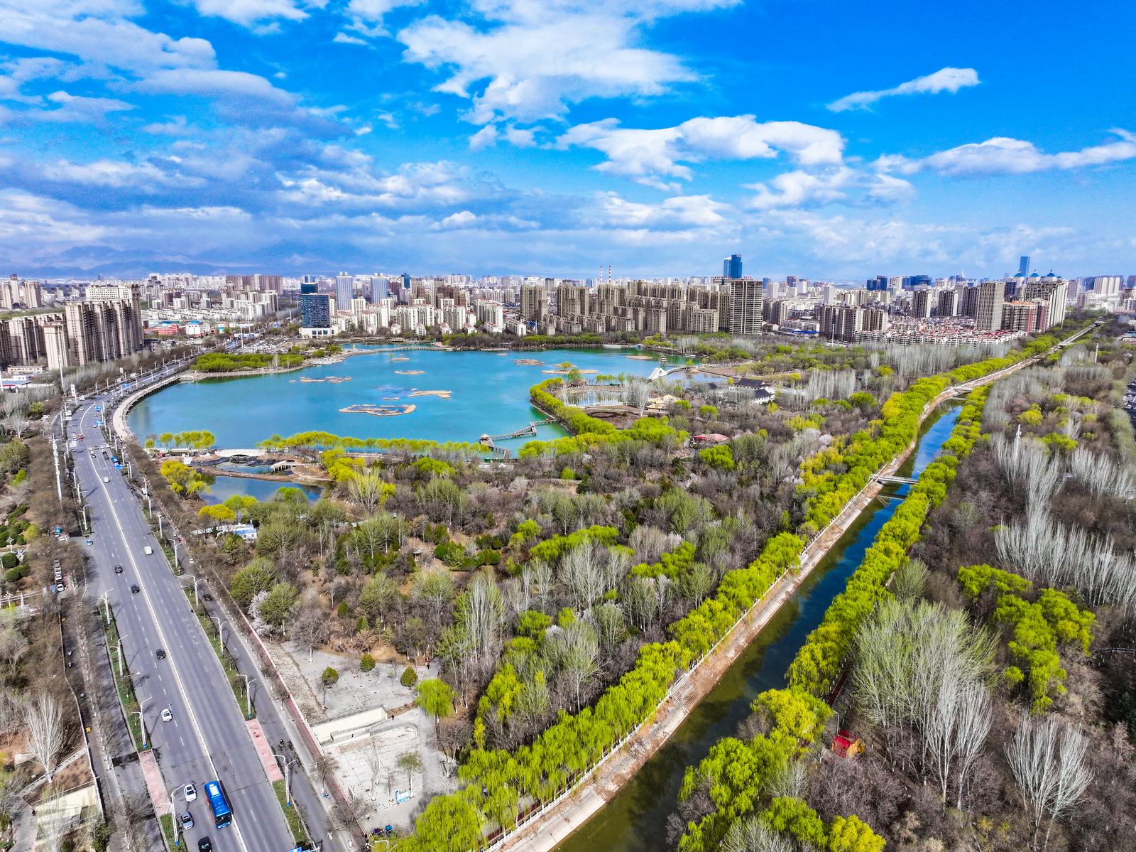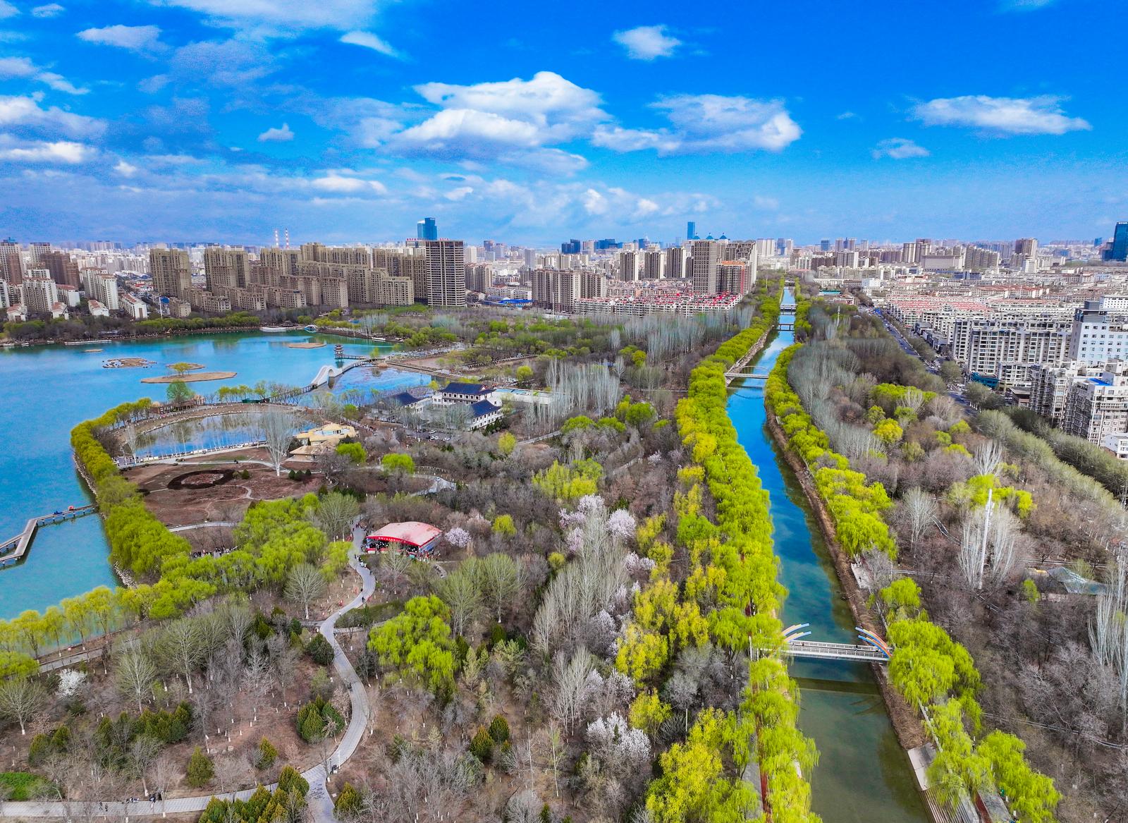 潺潺清流澄澈灵动,与两岸楼宇、新绿林木交相辉映,水在城中、城在绿中,为初春的银川添满诗意与生机。