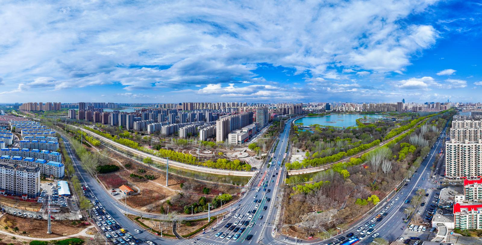 道路纵横交错,古渠在城中穿行。