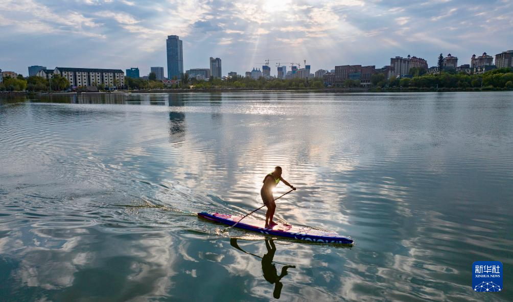 9月17日,市民在银川市海宝公园内进行水上运动(无人机照片)。
