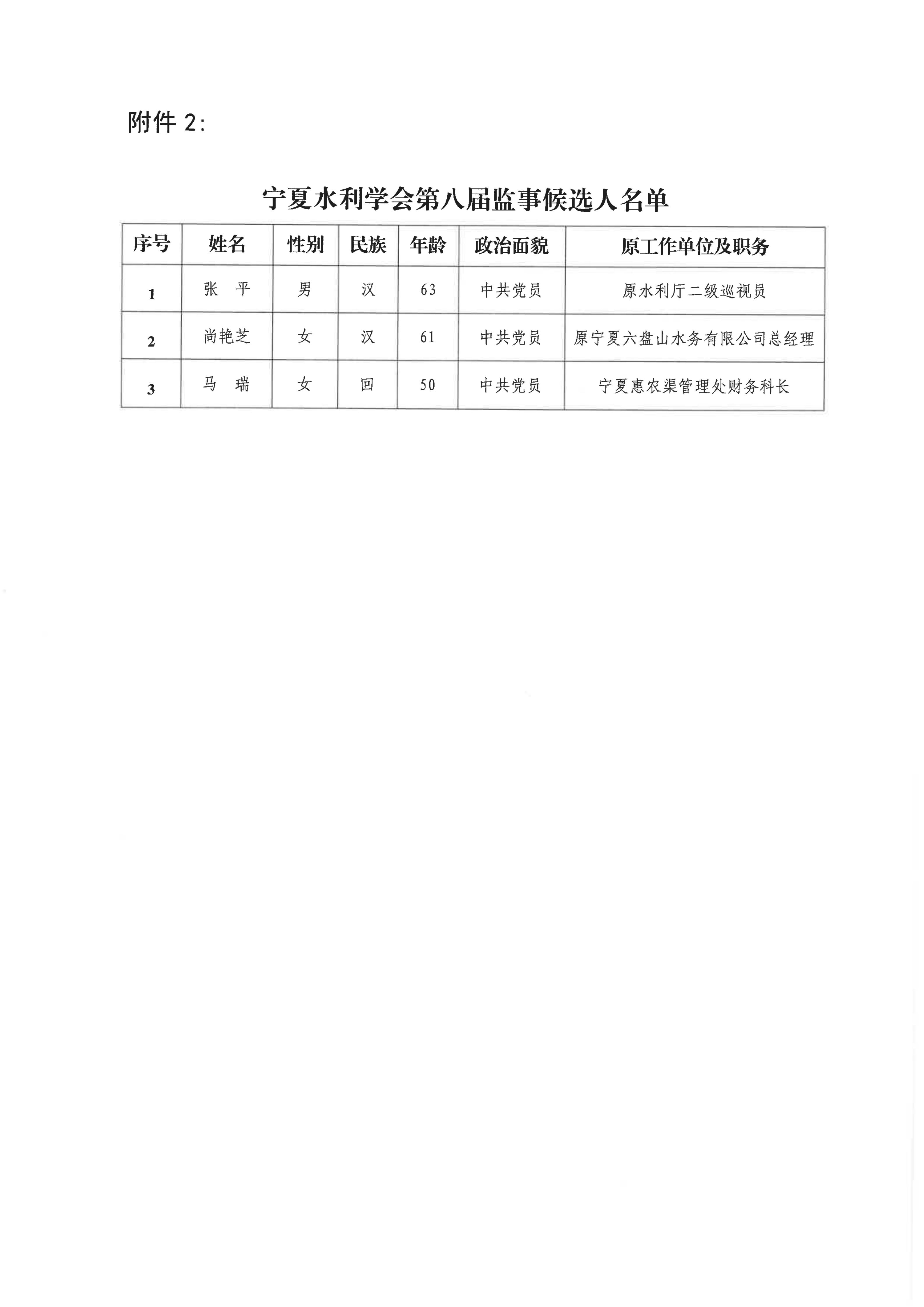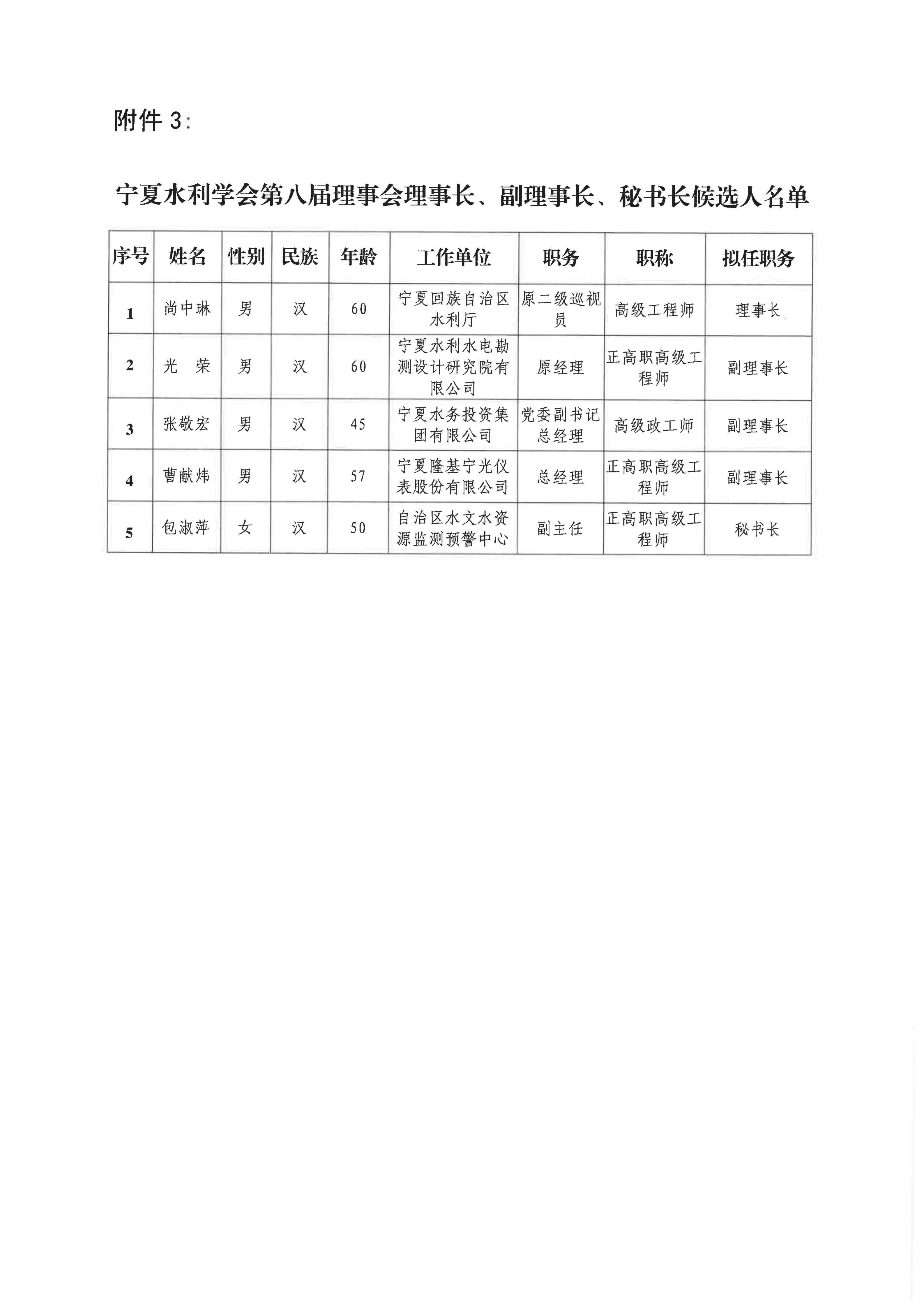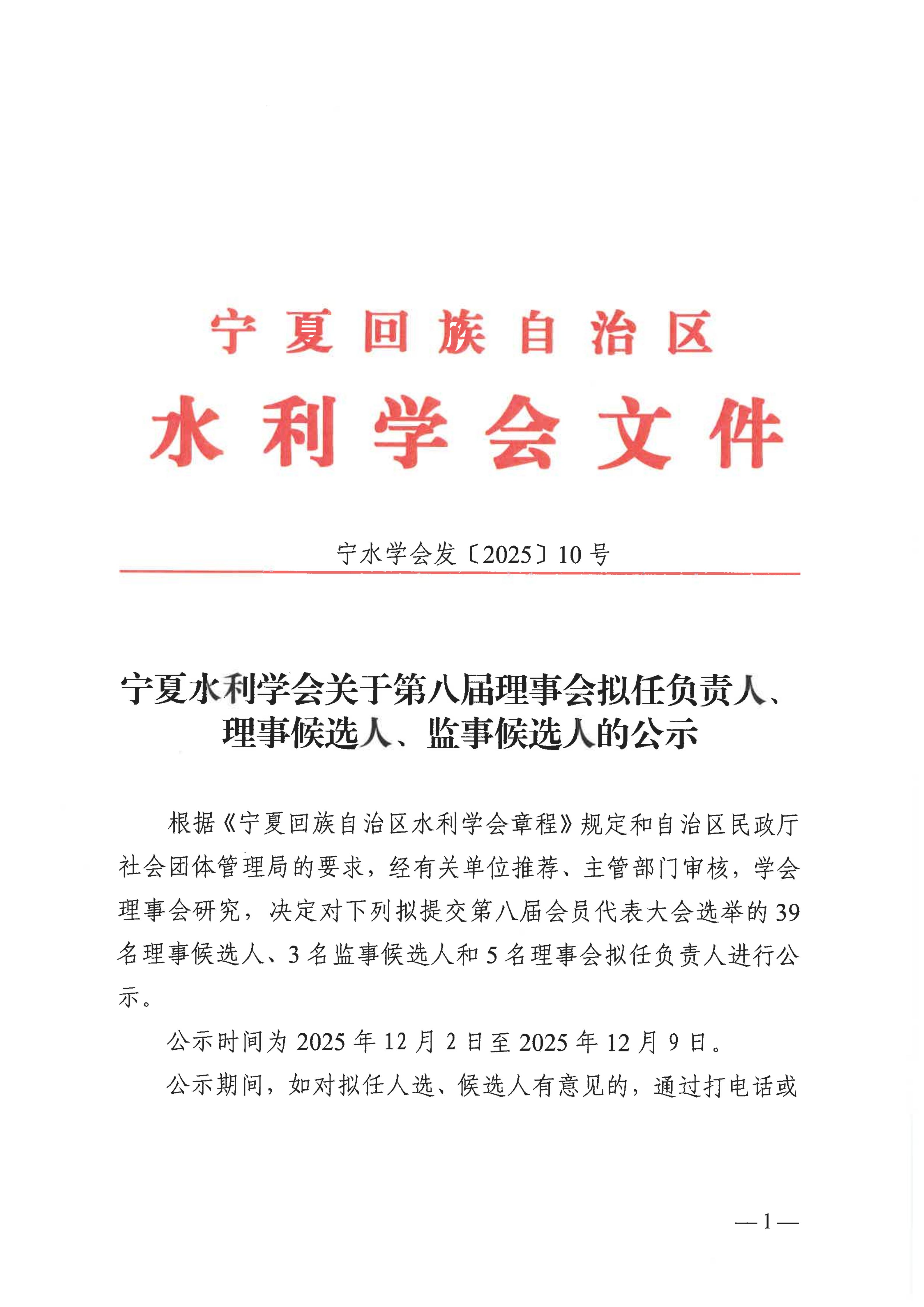 宁夏水利学会关于第八届理事会拟任负责人、理事候选人、监事候选人的公示 - 宁水学会发〔2025〕10号