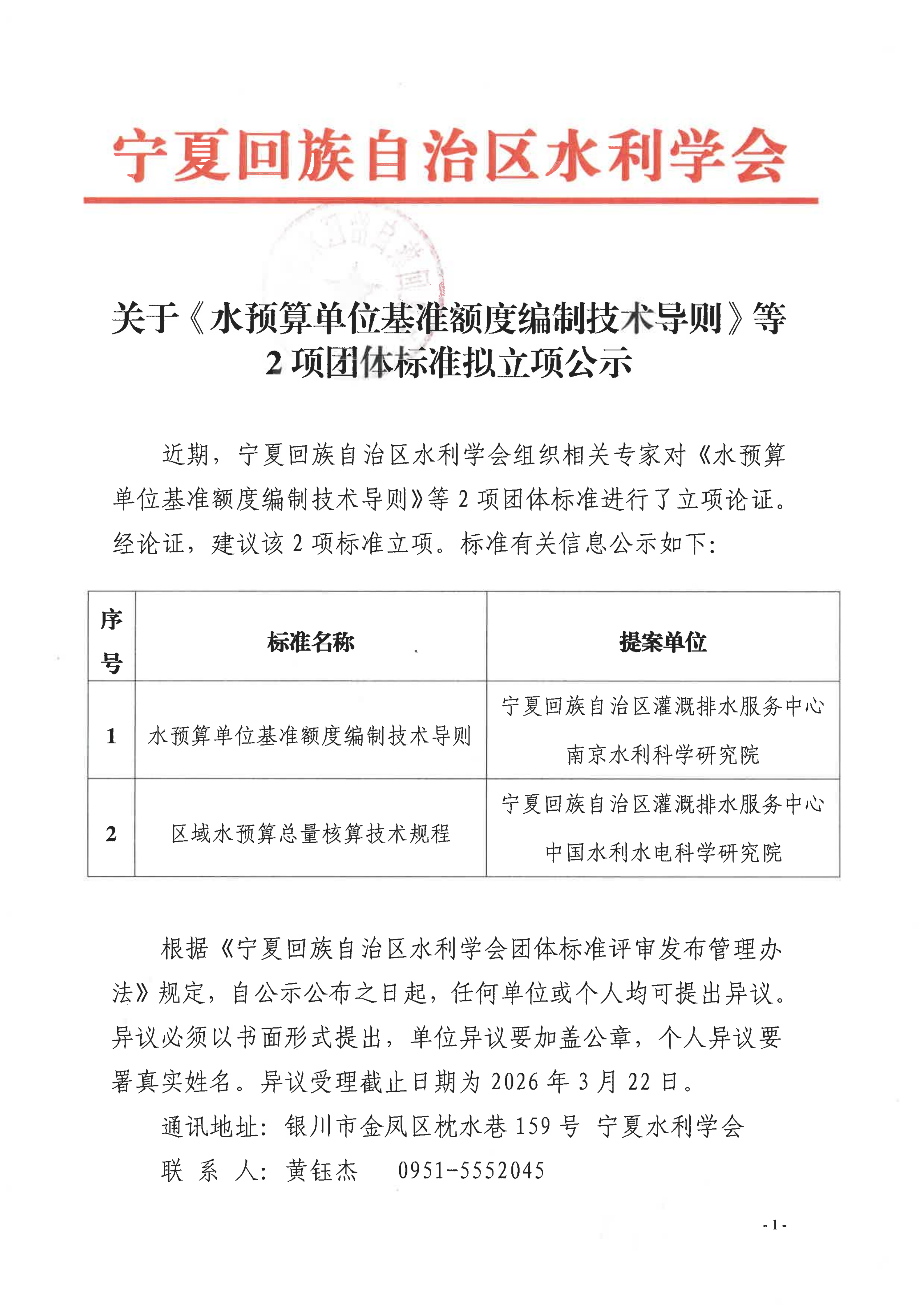 宁夏回族自治区水利学会关于《水预算单位基准额度编制技术导则》等2项团体标准拟立项公示
