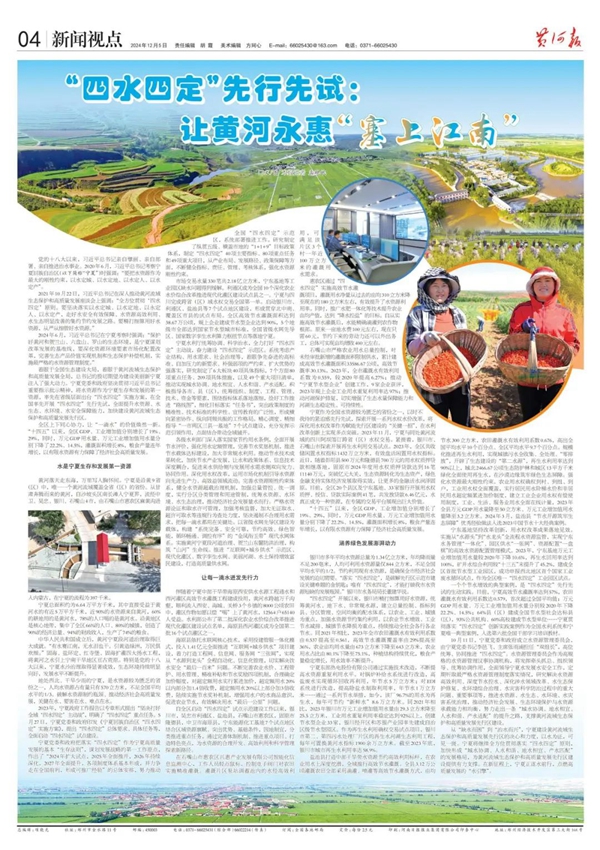 宁夏党委和政府把落实“四水四定”作为宁夏高质量发展的基本“生存法则”,谋划发展战略的第一工作原点,作出了“2024年扩大试点,2025年全面推开,2026年持续深化,2027年全面提升,各项制度体系基本形成,并力争走在全国前列,形成可推广经验”的总体安排,努力推动全国“四水四定”示范区,系统部署推进工作。研究制定了纵贯五级、横盖市地的“1+1+9”目标政策体系,制定“四水四定”40项主要指标、80项重点任务和49项重大项目,从产业布局、发展路径、政策保障等方面,不断健全指标、责任、管理、考核体系,强化水资源刚性约束。