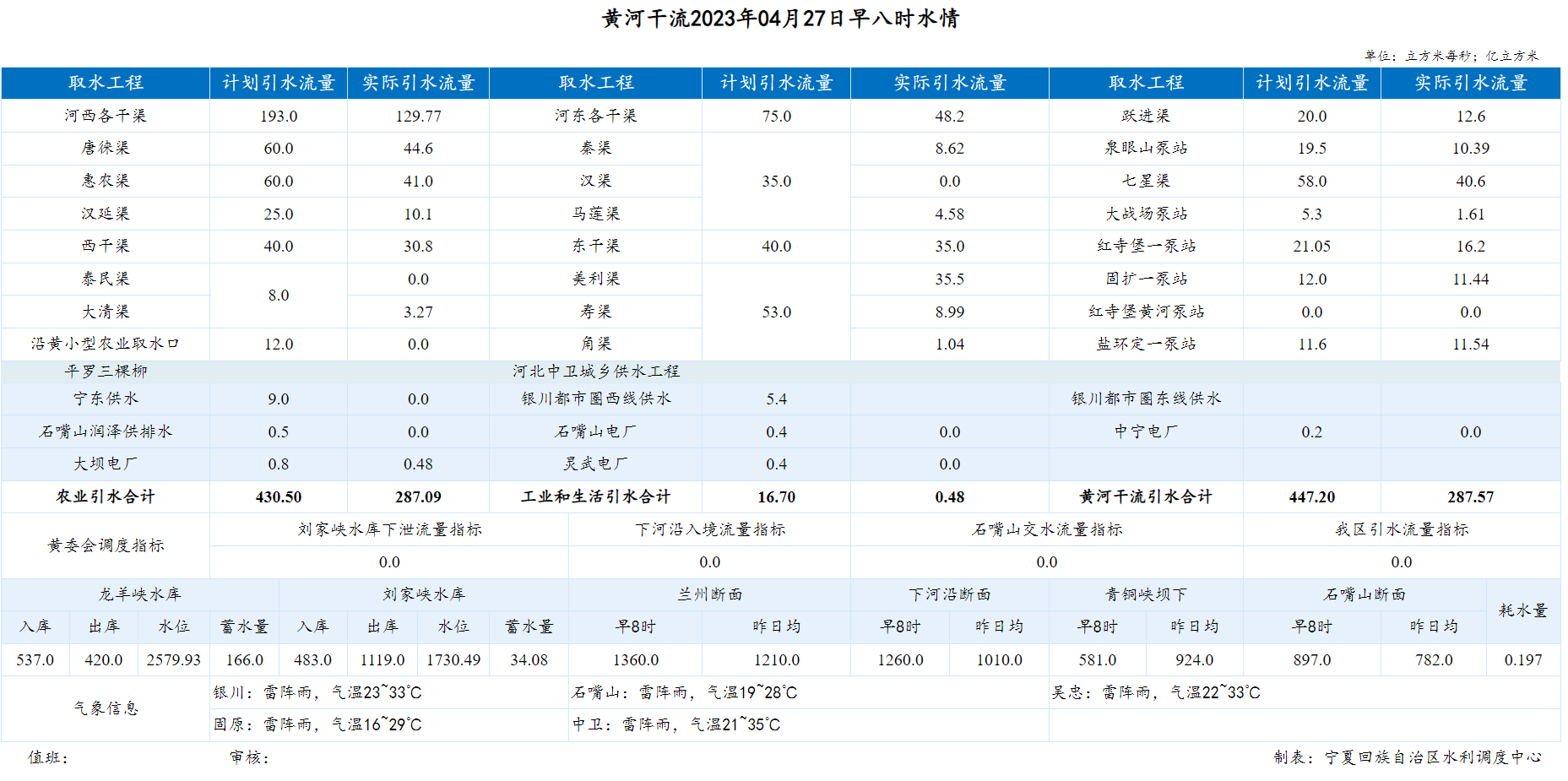 【黄河水情】4月27日,下河沿早8时流量1260.00m³/s