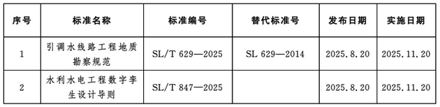 水利部关于批准发布《引调水线路工程地质勘察规范》等2项水利行业标准的公告