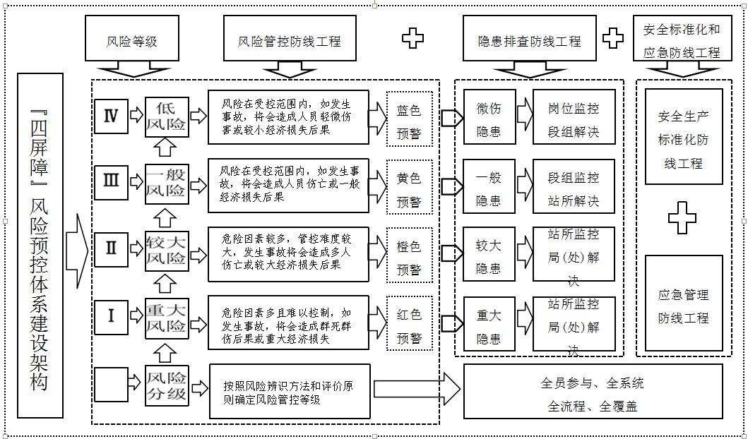 “四屏障”风险预控体系建设是安全文化建设的支撑和保障,是安全文化建设不可分割的组成部分。该体系建设的目的是为防止风险失控、隐患失查、标准化不达标、应急失效导致的生产安全事故。因此,开展“四屏障”风险预控体系建设意义重大,其主要任务: