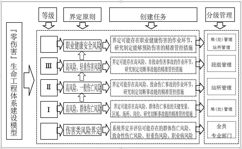 “零伤害”生命健康体系建设包括群体伤亡风险管控措施建设、一般伤亡风险管控措施建设、轻重伤害风险管控措施建设、职业健康风险管控措施建设。是按照“管风险要优先管控伤害风险”的理念而建设的生命健康安全保障体系。通过分析危险源能量特性、事故伤害类型、事故伤害程度、事故伤害路径,按照海因里希事故链法则,研究能够切断事故链,有效管控伤害风险的措施,形成一套管理科学、管用有效的“零伤害”风险管理模式。其创建体系架构如图4所示。