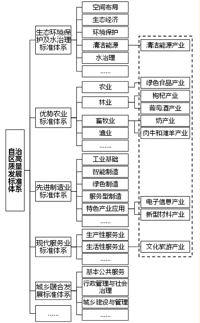 ——编制自治区生态环境保护及水治理、优势农业、先进制造业、现代服务业和城乡融合发展等五大领域标准体系。